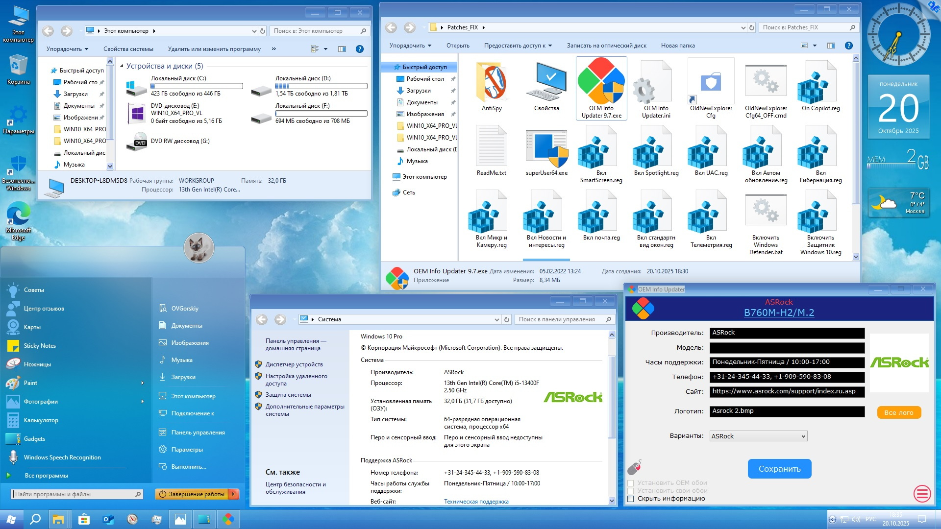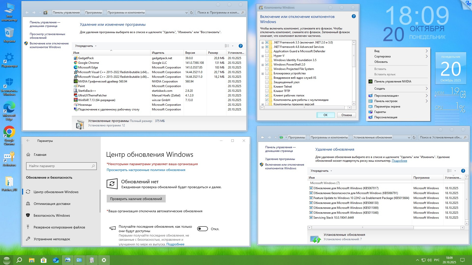 Сборка на основе оригинального русского образа Windows 10 Pro VL (22H2) с обновлениями по Октябрь 2025 года от Microsoft и дополнительным материалом . Установка полностью стандартная "вручную" с выбором параметров установки ОС. Интегрированы: программа для возврата в систему привычных нам кнопки и меню "Пуск", гаджеты для рабочего стола, дополнительные темы и картинки рабочего стола, обновления системы и пр.