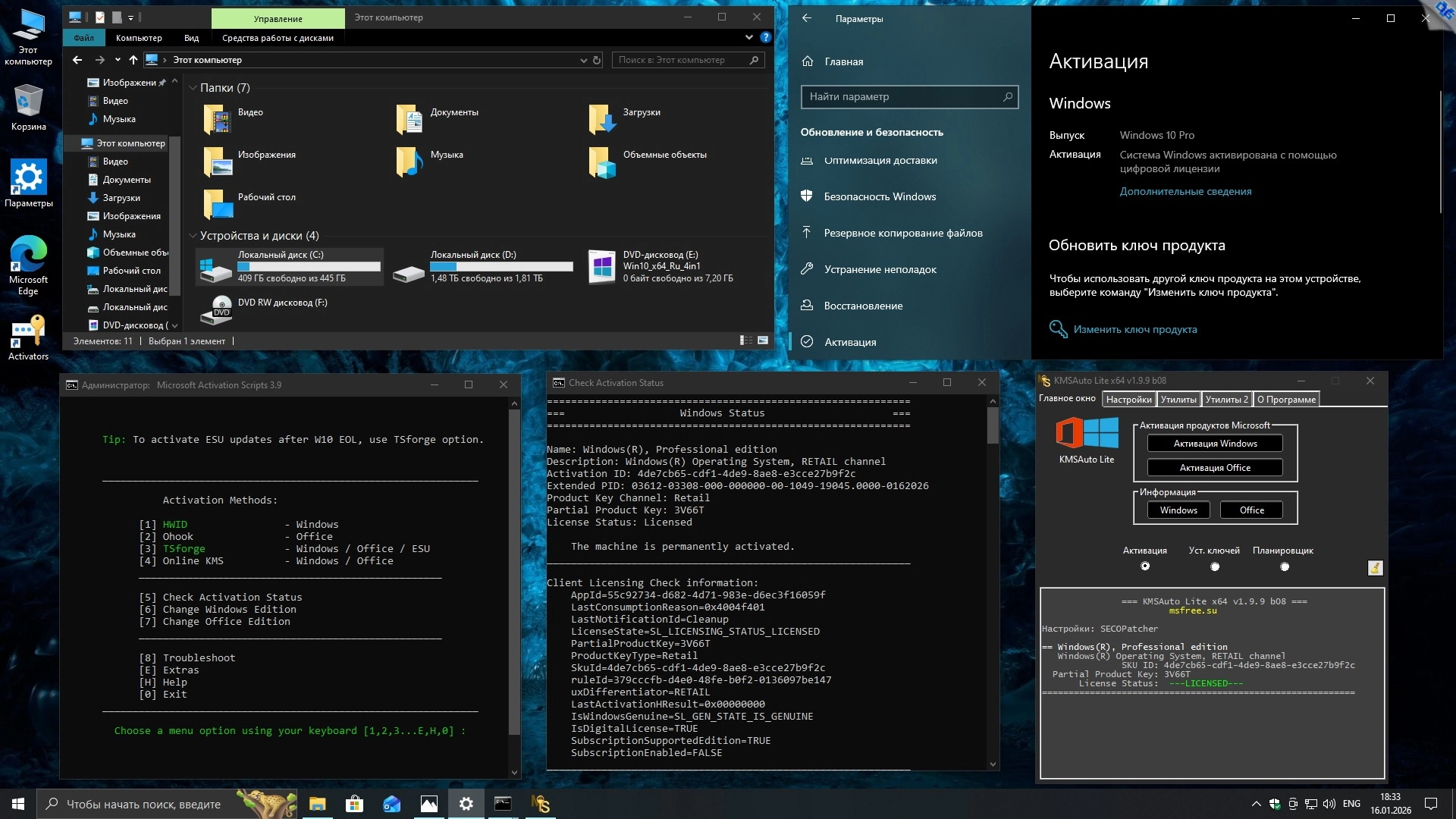 Другой простой и надёжный активатор Microsoft Activation Scripts (MAS_AIO) (запускать от Администратора)