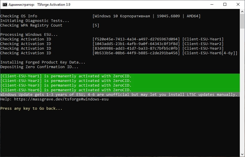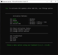 Имеет несколько режимов: Метод HWID (цифровая лицензия) для постоянной активации Windows. Активация происходит после подключения к интернету. Рекомендуется для Домашней и Про. редакций. Метод TSforge-ESU для активации всех редакций Windows 10, включая корпоративную (Activation-Windows). Также этим методом можно активировать бесплатное получение обновлений ещё на 3 года (Activation-ESU) до 2028 года и далее
