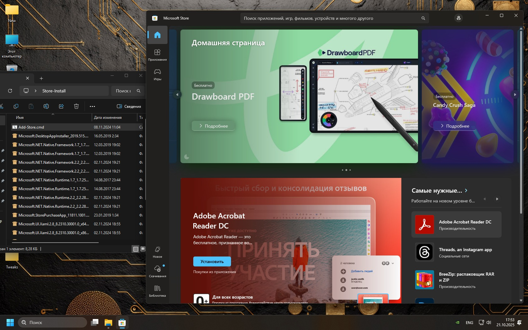 Сборщики часто пишут – «запускайте wsreset -i и Store установится». На самом деле – этот метод не самый лучший, и далеко не всегда работает на всех сборках. Чтобы вы гарантированно установили Store (+ всё нужное для него) – мы добавили оффлайн установщик Store. Открываете папку Store-Install (на Рабочем столе) и от имени Администратора запускаете Add-Store.cmd.