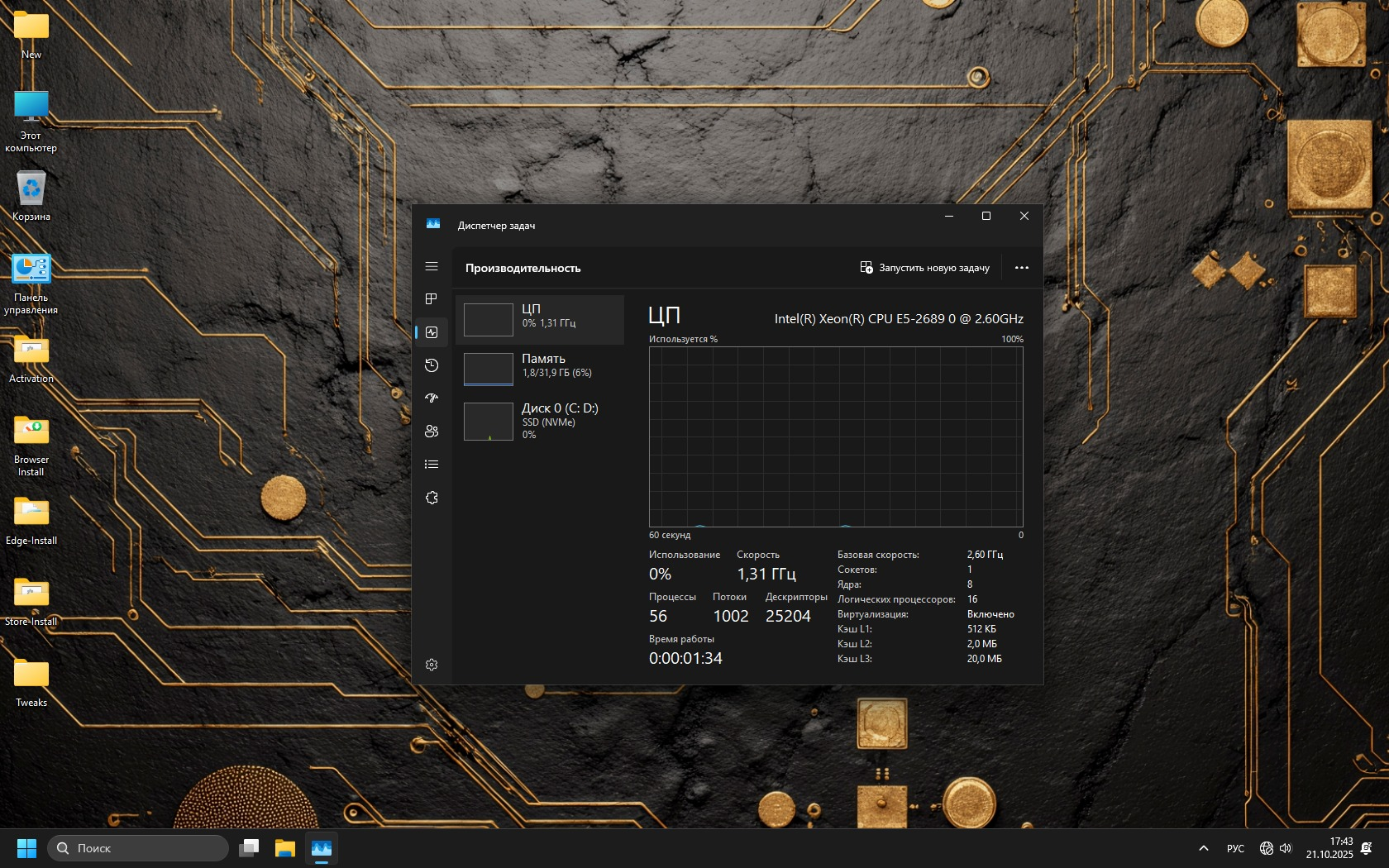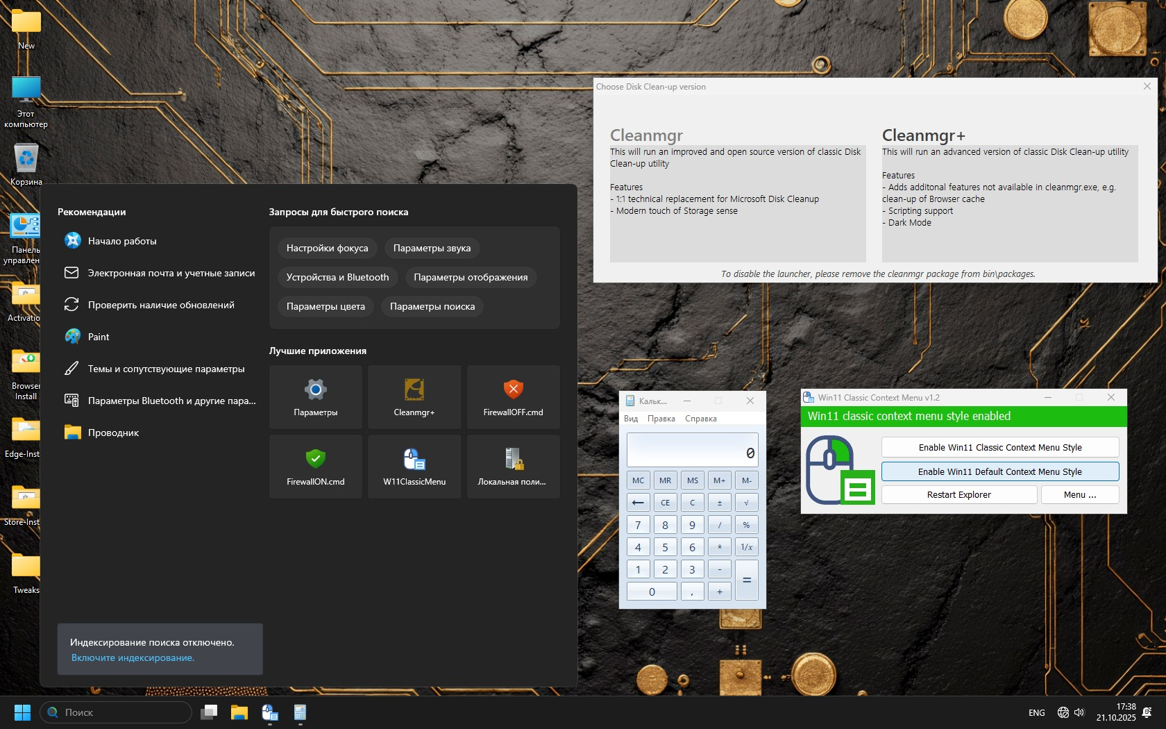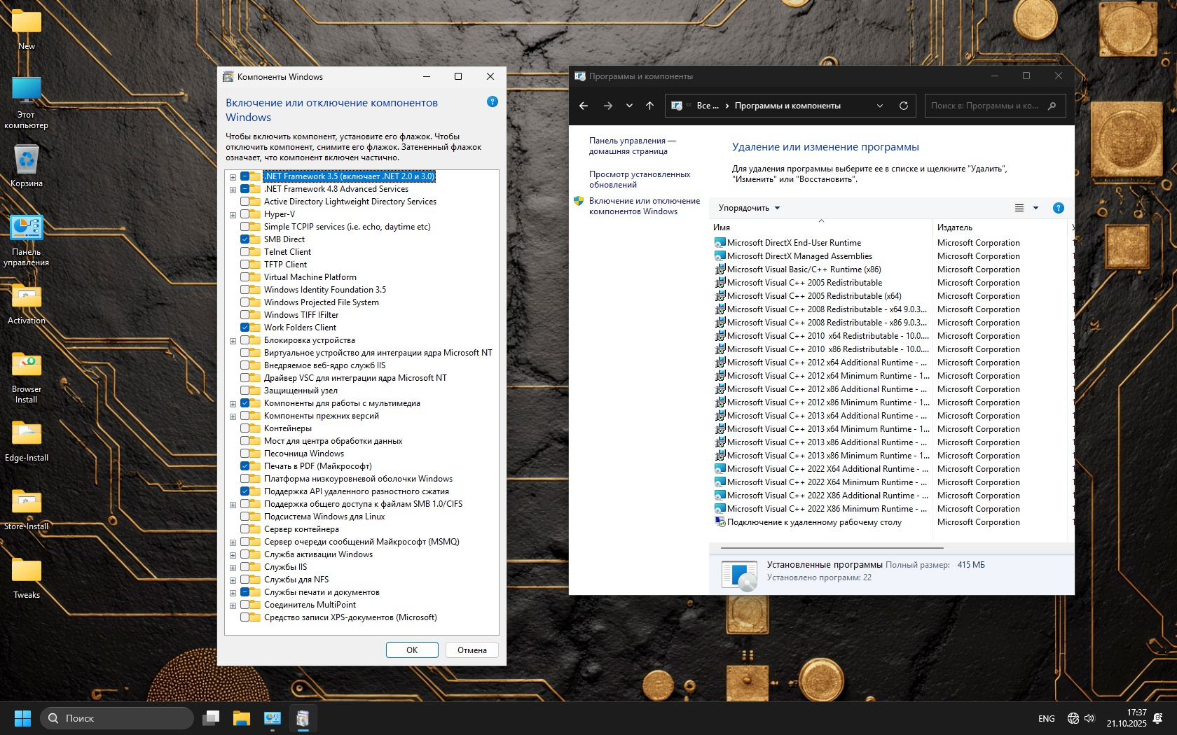 • Сборка полностью настроенная, очень быстрая и максимально удобная. Есть дополнительные твики на Рабочем столе, но используйте их только если понимаете назначение твика (а не все настройки подряд). Если вы захотите вернуть в систему Store и Edge – то для этого тоже предусмотрены возможности, но напоминаем, что с Эджем и Магазином сборка будет потреблять существенно больше RAM. Поэтому, если у вас объем RAM составляет всего 4-8 ГБ, то рекомендуем обойтись без фирменного браузера Microsoft и их маркетинговых функций (в виде Store и т.д.).