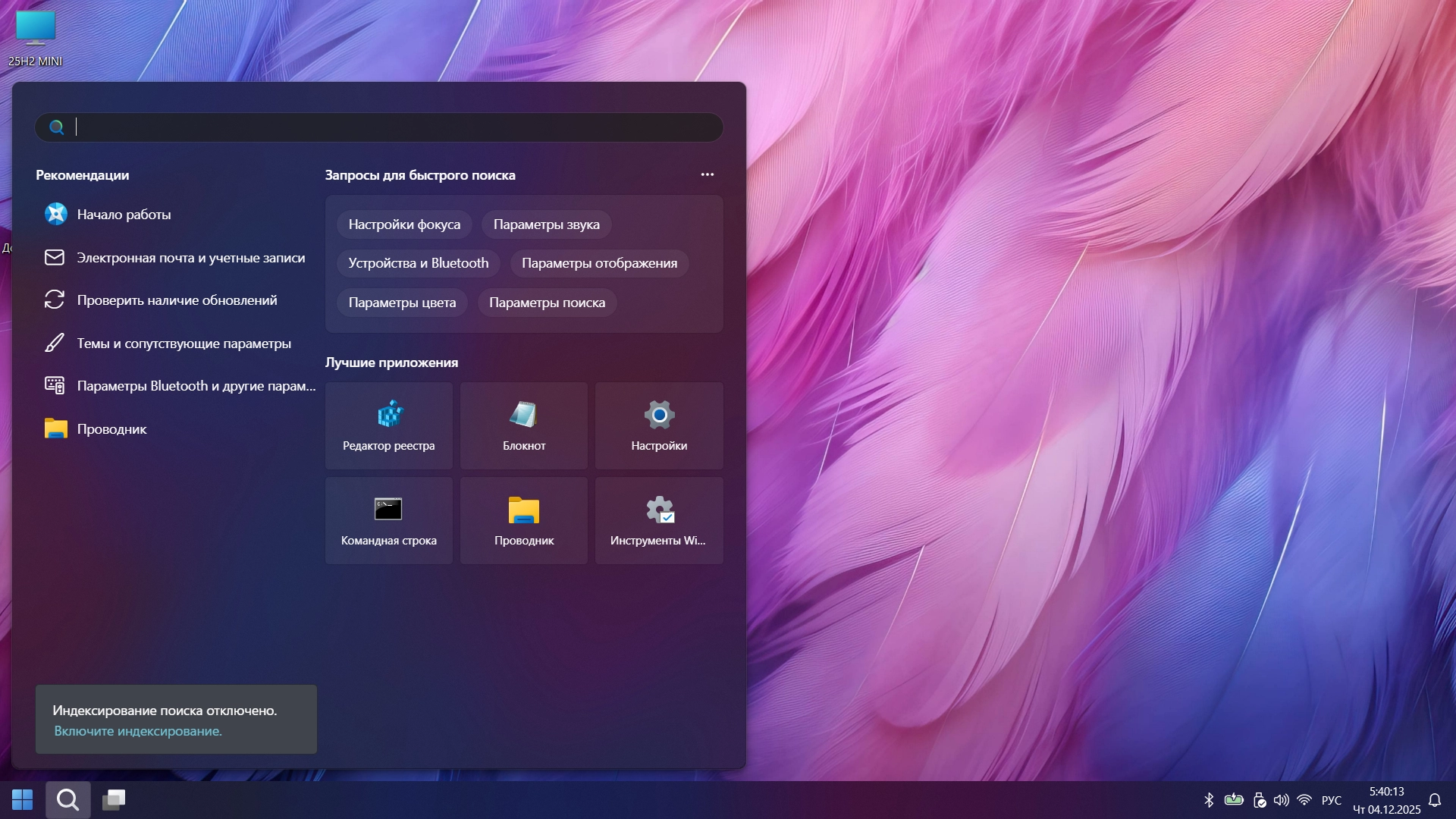 • Windows Search отключён в службах. Поиск из панели задач, навигации папок, панели управления работает;