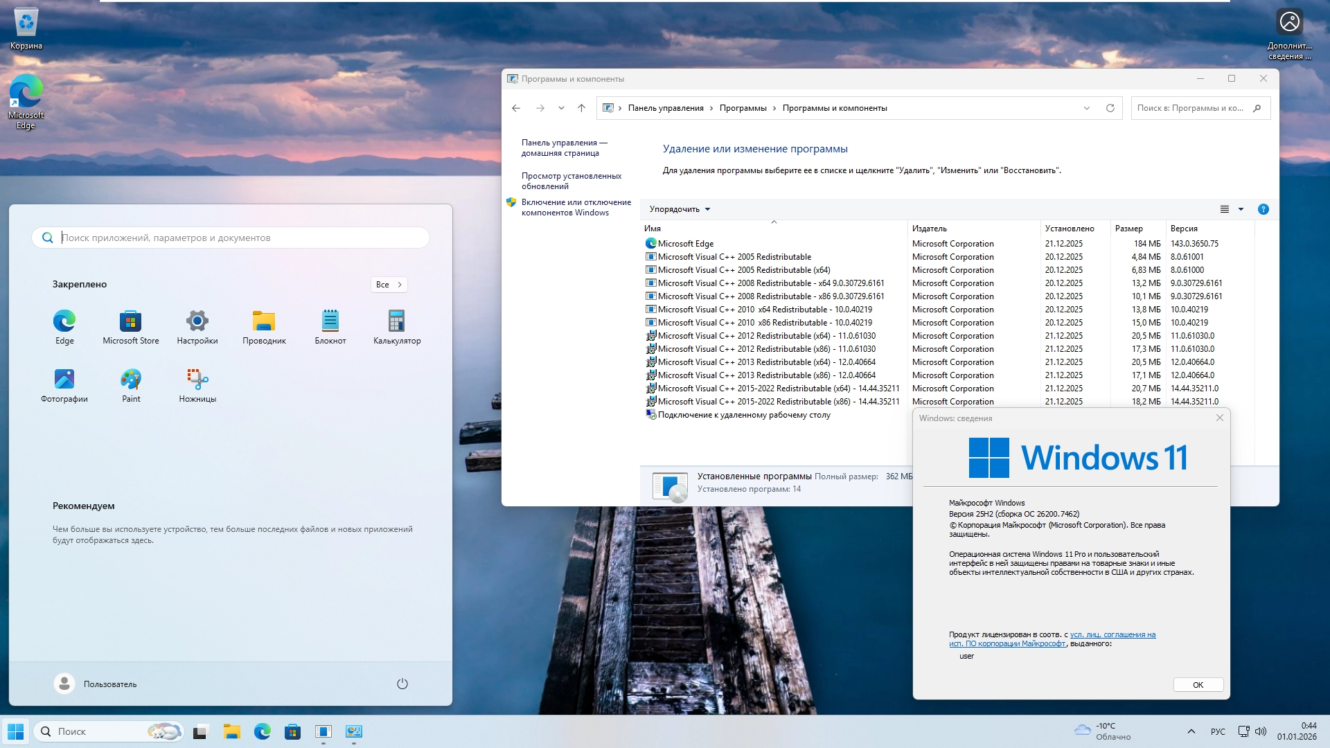 Windows 11 v25H2 26200.7462, включающая в себя 5 редакций x64 с русским и английским интерфейсом и 2 облегченные x64 Lite-редакции, с обновлениями по 12.2025, дополнительными системными библиотеками (C++ Redistributable Package), с возможностью выбора опций установки и наличием MSDaRT. А также инсталляции Windows c уже предустановленным (или без - по выбору) Word, Excel и PowerPoint.