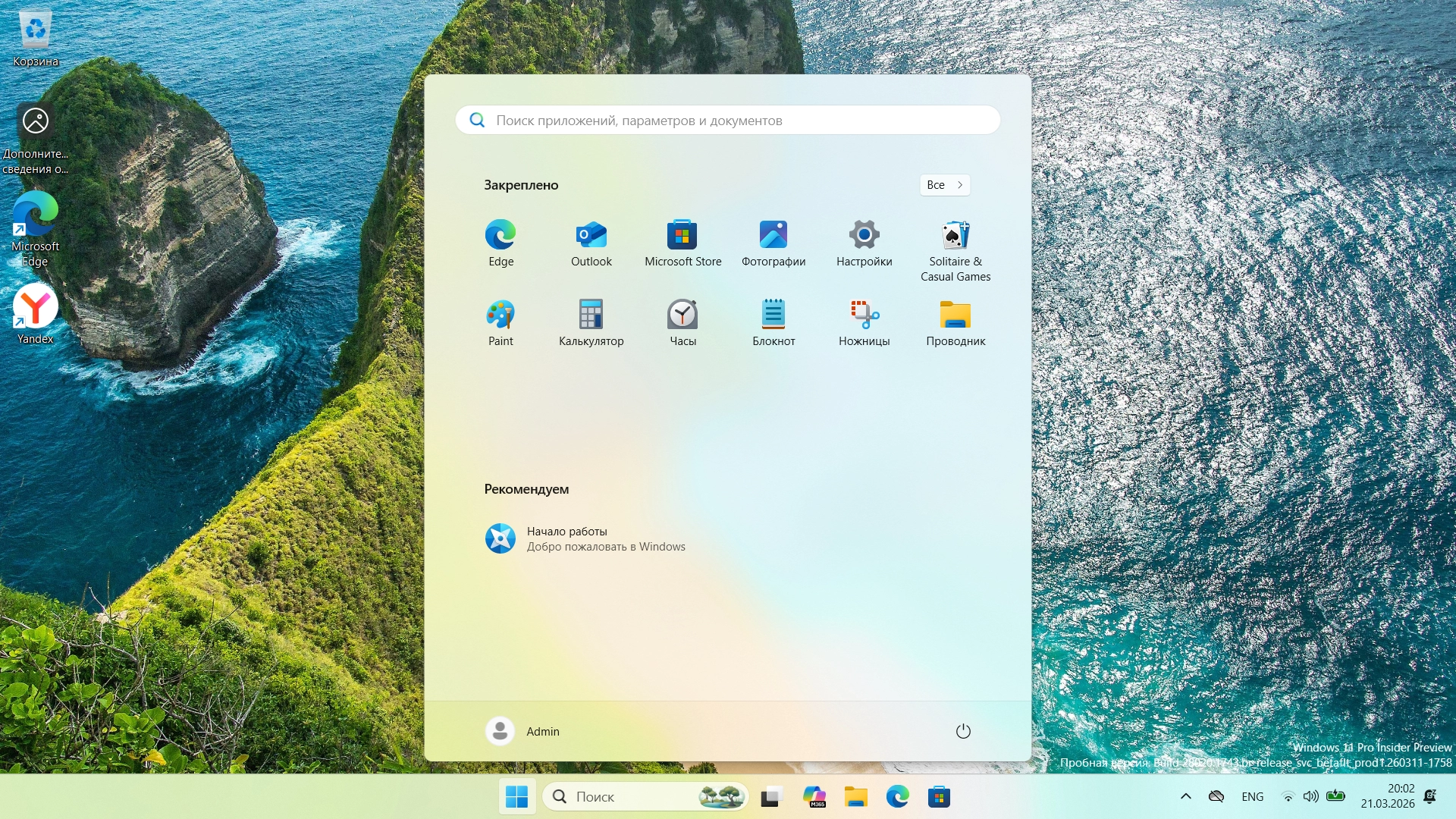 Сборка операционной системы Windows 11 26H1 с обновлениями от 20 марта 2026 года распространяемые на канале Canary. В систему не вносилось никаких изменений, все службы и приложения работают по умолчанию. Использован универсальный загрузчик для обхода ограничений по железу и полуавтоматической установкой (только имя пользователя и раздел для установки).