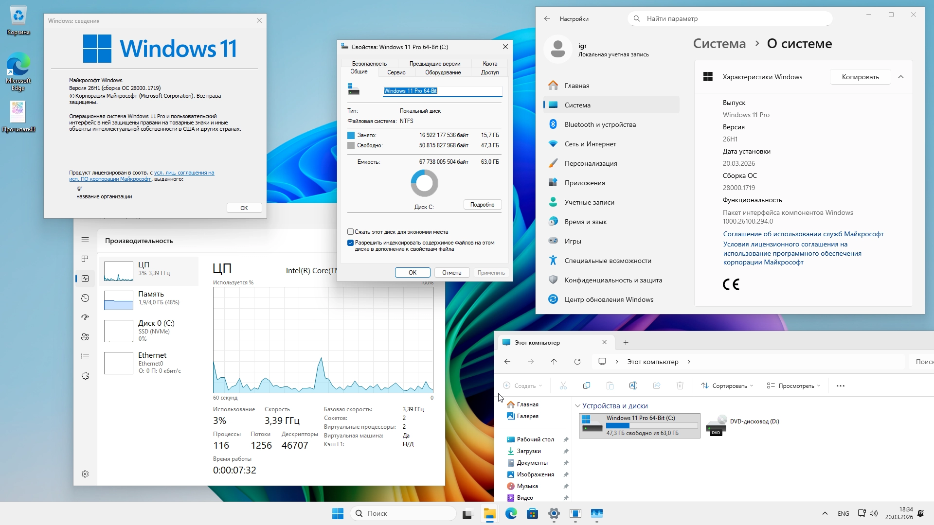 • Изменено имя диска "C" на "Windows 11 Pro 64-Bit"