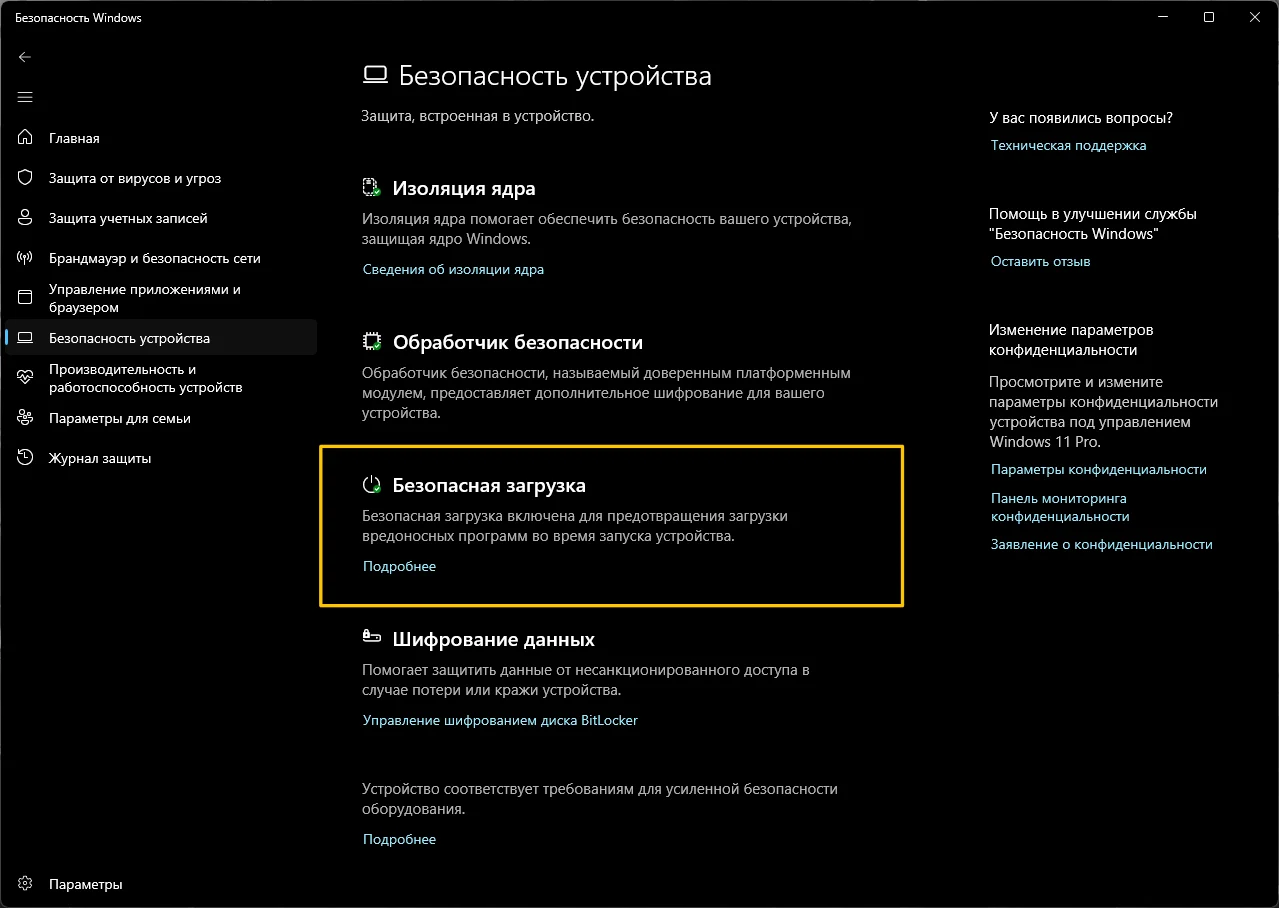 • Новое: продолжается внедрение обновлённого интерфейса в разделе Безопасность Windows > Безопасность устройства > Безопасная загрузка (Secure Boot).